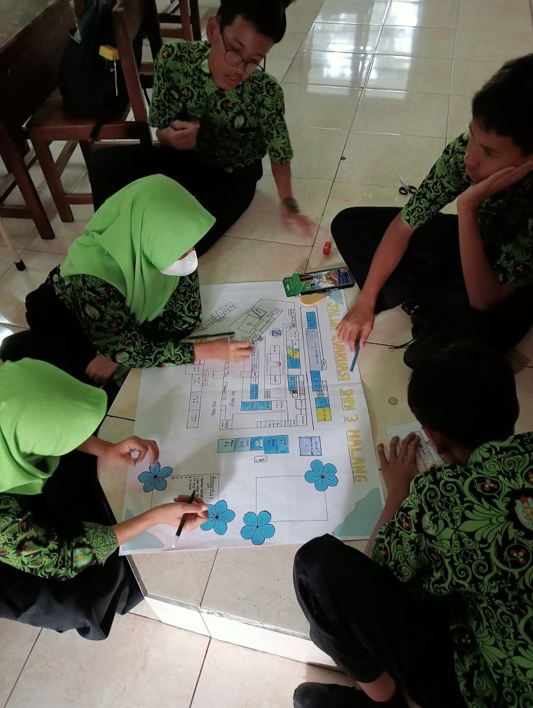 Beberapa orang siswa tampak begitu sibuk. Mereka memegang alat tulis masing-masing. Ada yang membawa bolpoin, spidol ataupun pensil warna. Sementara itu siswa yang lain sedang membuat ornamen kecil-kecil dari kertas lipat warna-warni dan memberi sentuhan artistik di lembaran kertas besar di hadapan mereka. Di bagian tengah kertas tersebut denah SMP Negeri 3 tergambar dengan jelas. Ya, siswa kelas delapan hari itu sedang melakukan mapping sekolah dan menggambar jalur evakuasi di SMP Negeri 3 Malang.