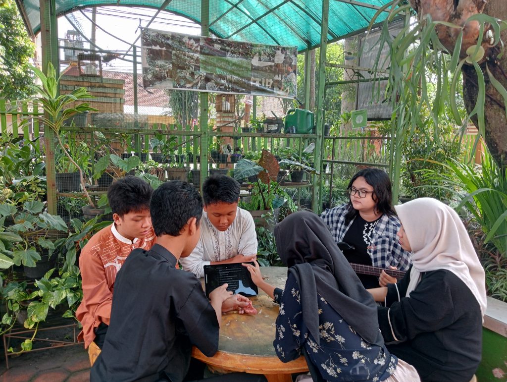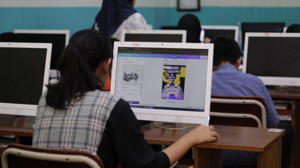 Di tempat yang lain lagi siswa sibuk membuat tulisan aksara Jawa, membuat poster digital juga poster manual. Berbagai pesan tersampaikan lewat karya siswa, misalnya tentang anti bullying.