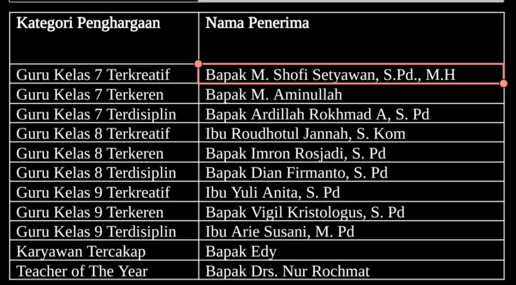 Acara mencapai puncaknya dengan pembacaan Teacher Awards sebagai bentuk apresiasi sekolah terhadap dedikasi para guru dalam kategori yang berbeda. Berikut adalah daftar penghargaan yang dianugerahkan: